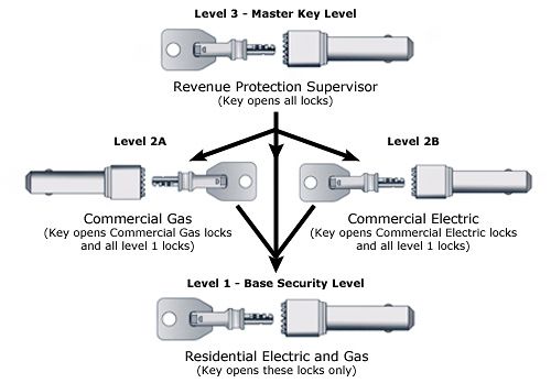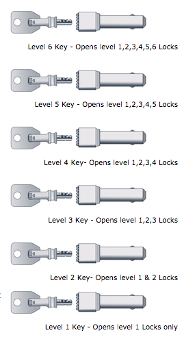 The Agbay Lock and Key System features unprecedented versatility and can be customized to suit a utility company’s specific needs. For example, lock levels 2 through 6 feature the ability to be subdivided (see illustration below), thereby providing an enhanced palette of system configurations.